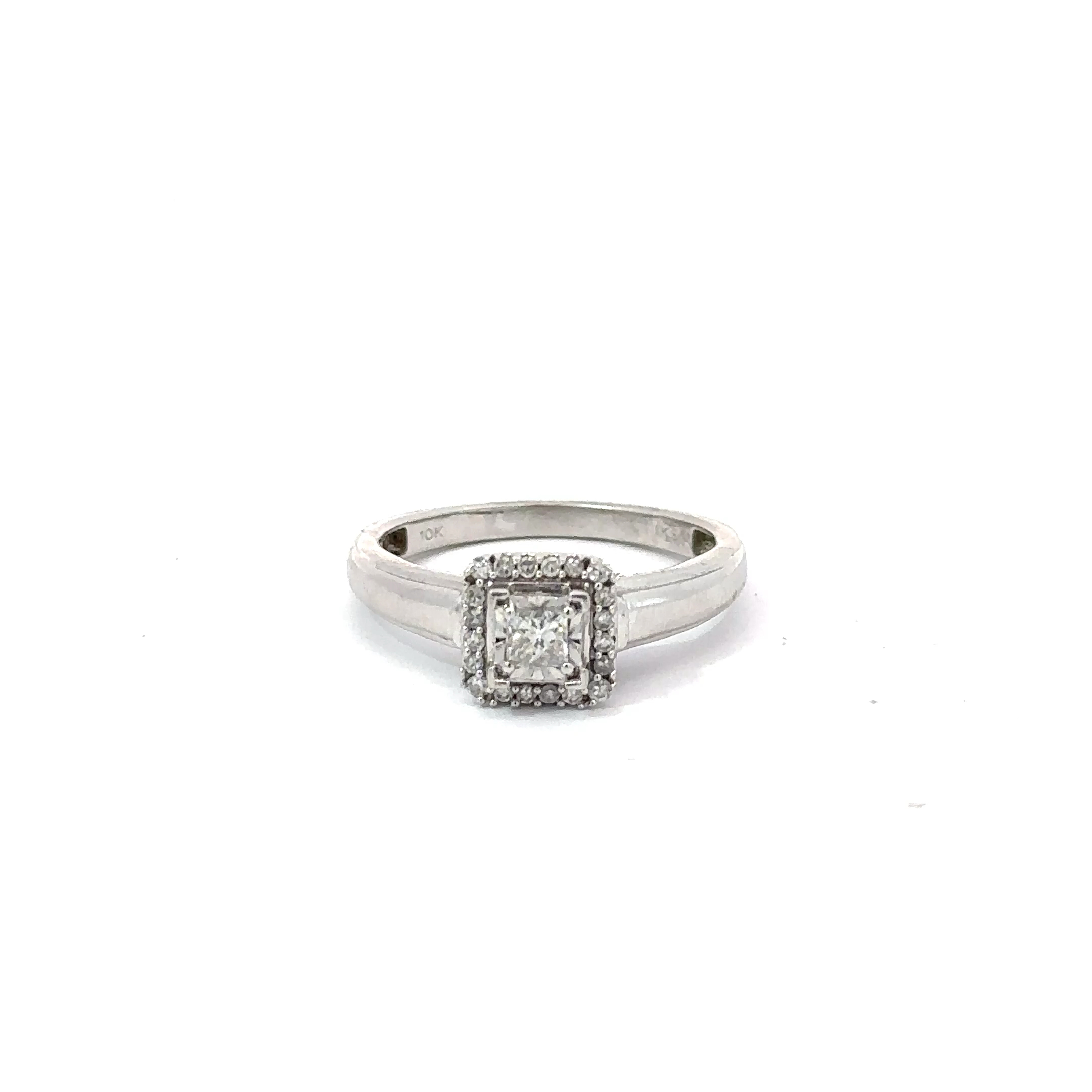 10k Stunning White gold and diamond ladies ring. This amazing Ring features a bezel set .2ct center stone, Bezel set means that the stone is set inside of a diamond-cut bezel and made to appear slightly larger than it is. Surrounding the bezel set diamond is a frame of brilliant cut diamonds approximately .2cttw. On either side of the setting is a crescent of brilliant cut stones approximately .05ct in weight. This ring is an absolutely gorgeous piece featuring all natural diamonds and is incredible value for money.