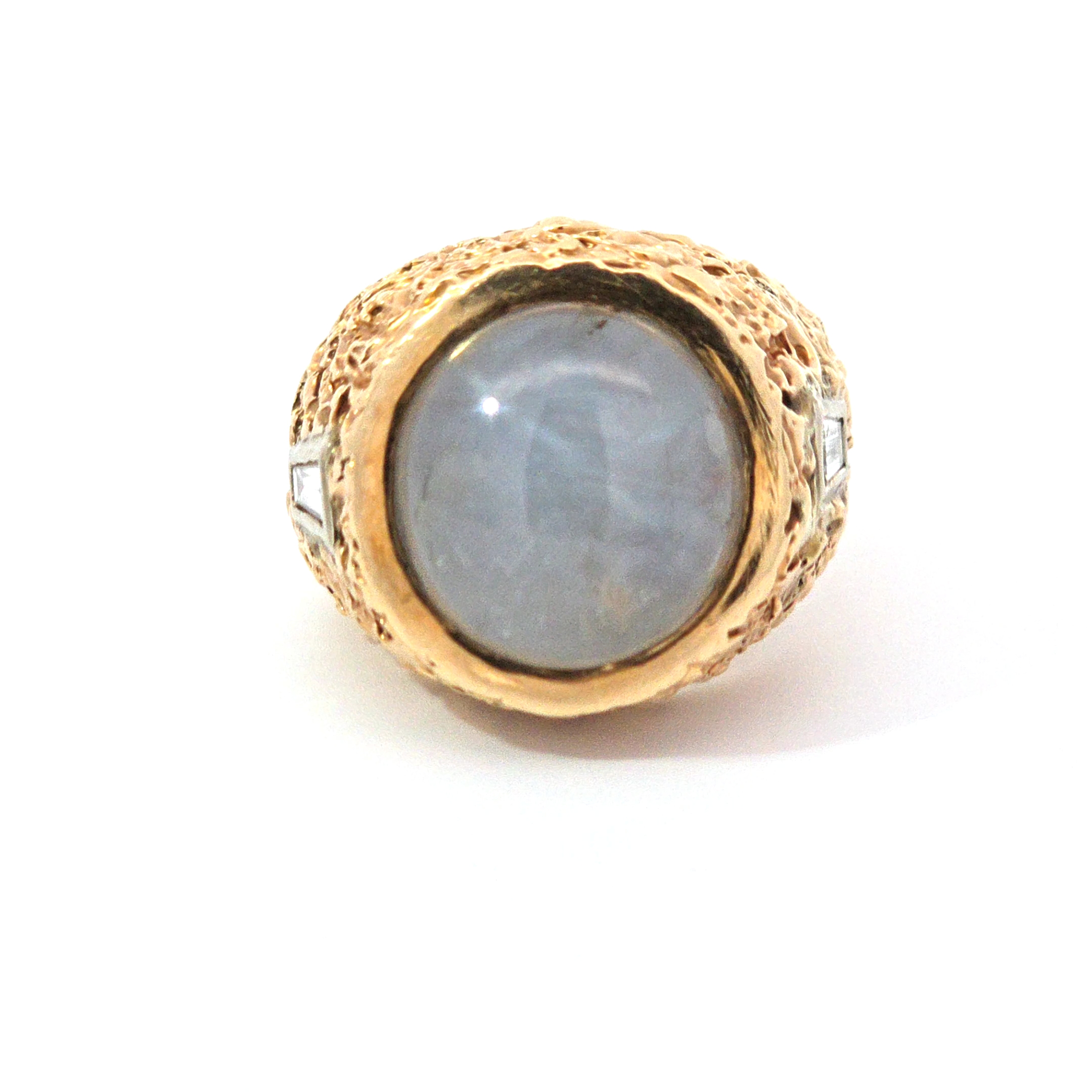 14k Men’s Pinky Ring. This Ring features a stunning star sapphire in the center approx. 10ct. On either side of the nugget style ring are a bezel-set emerald cut diamond. These diamonds are approximately .3ct each. This ring is an incredible oldies throwback piece and can fit with a lot of retro modern outfits and styles.