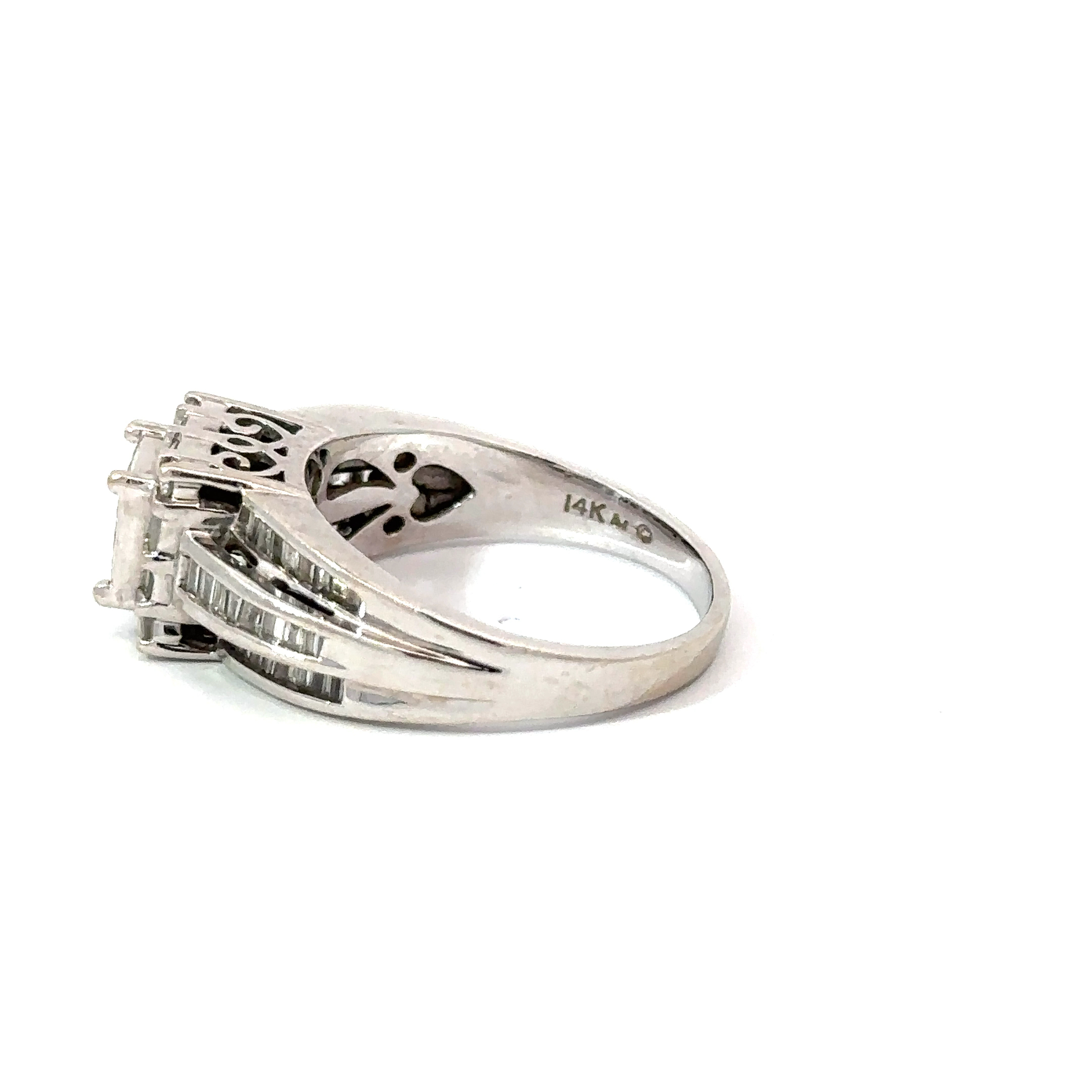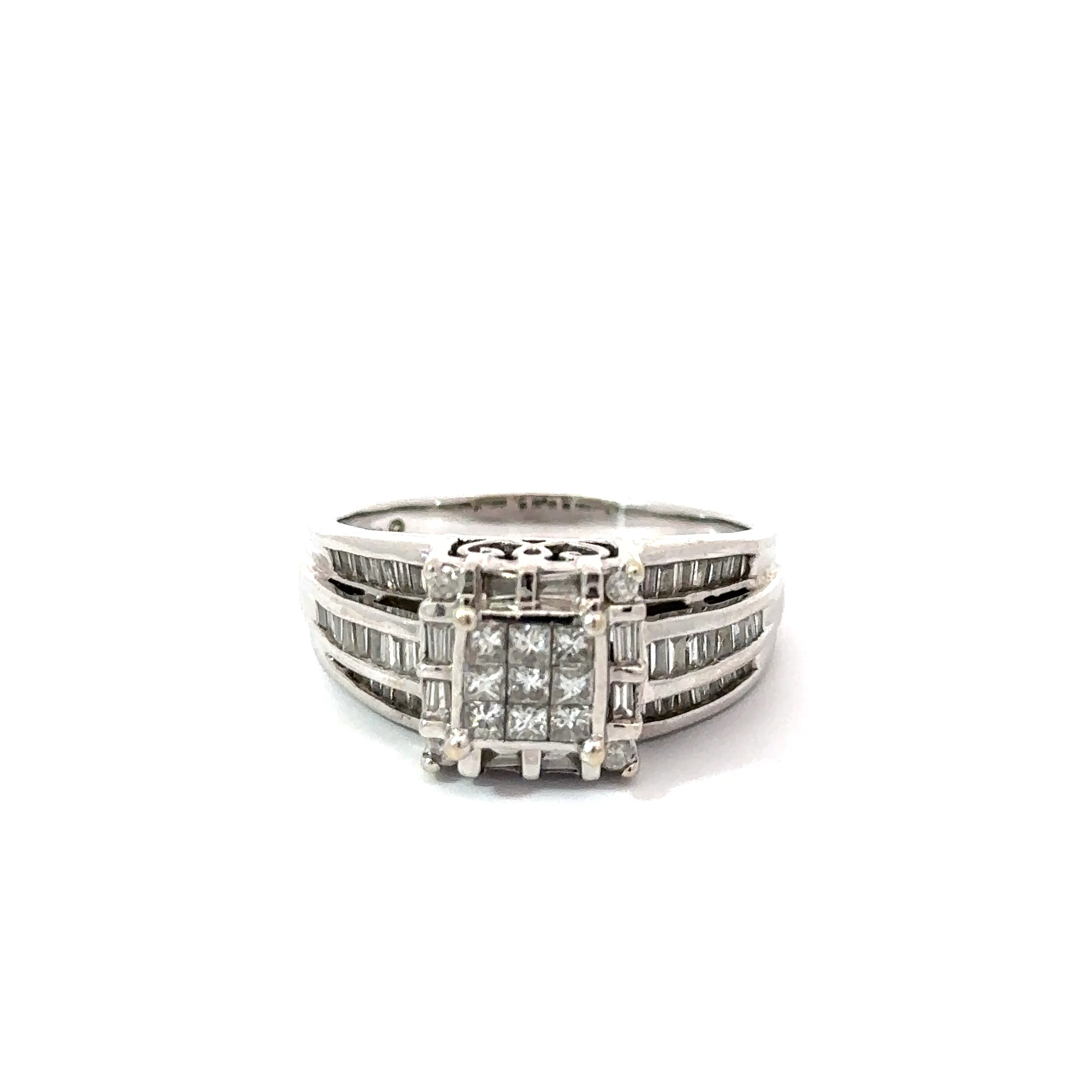 This Stunning 14k white Gold cluster ring is a showstopper. A gorgeous and stylish setting and 9 princess cut diamonds channel set into the center of this ring. Down either side of the setting are baguette diamonds in 3 rows. Framing the center channel is a border of baguette diamonds with a brilliant cut set at each corner. Approximately 1cttw in natural diamonds.