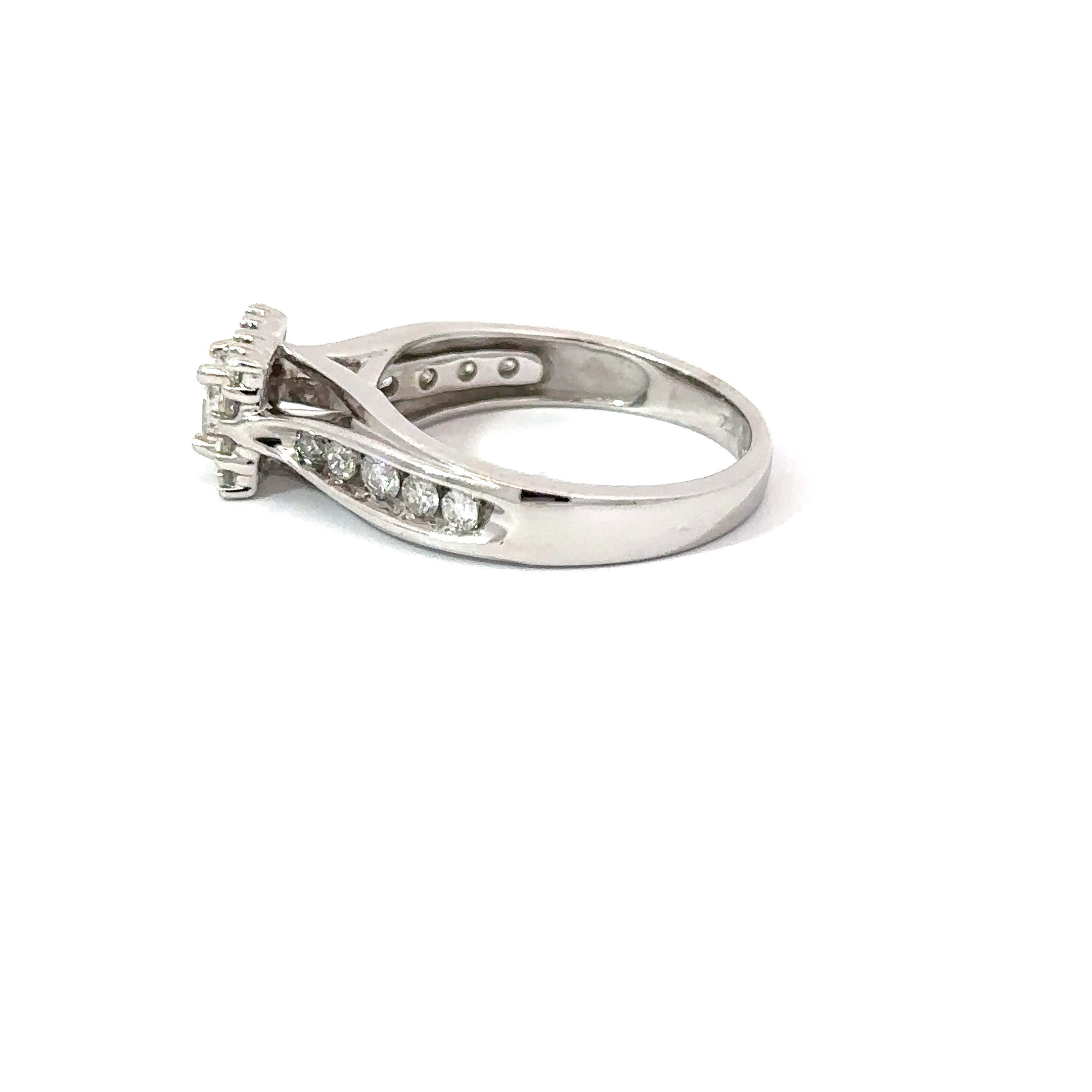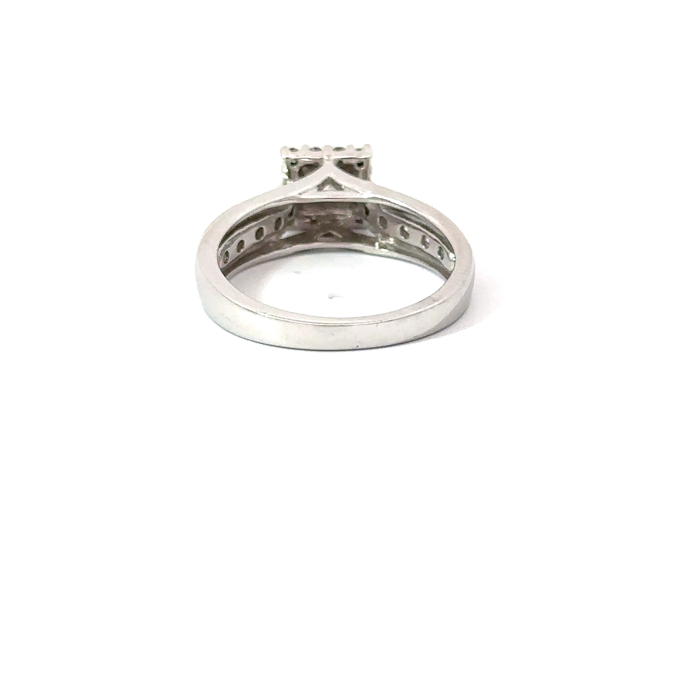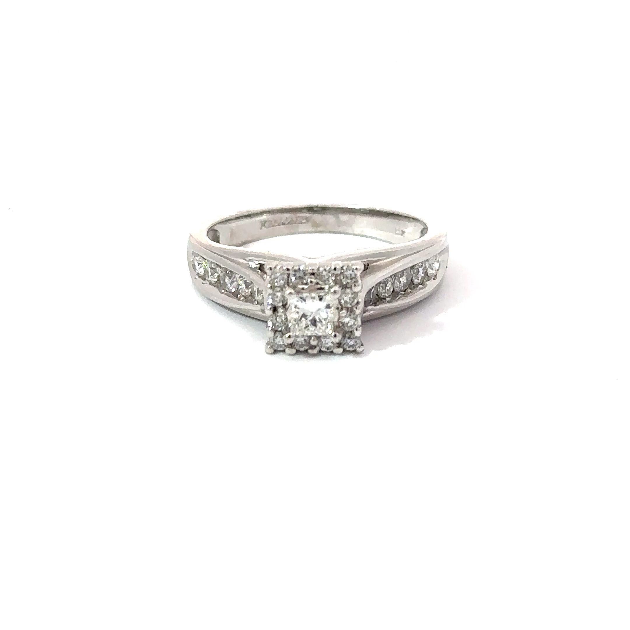 Gorgeous Princess cut 14kt white gold engagement ring with around 1ct total weight of diamonds. This Ring Features a princess cut center stone approximately .3ct. Set along the sides of this ring are 10 round cut diamonds weighing approximately .25ct total. This Ring also features a diamond frame around the main stone. This ring is truly brilliant in person and sparkles like a Vampire in Washington.