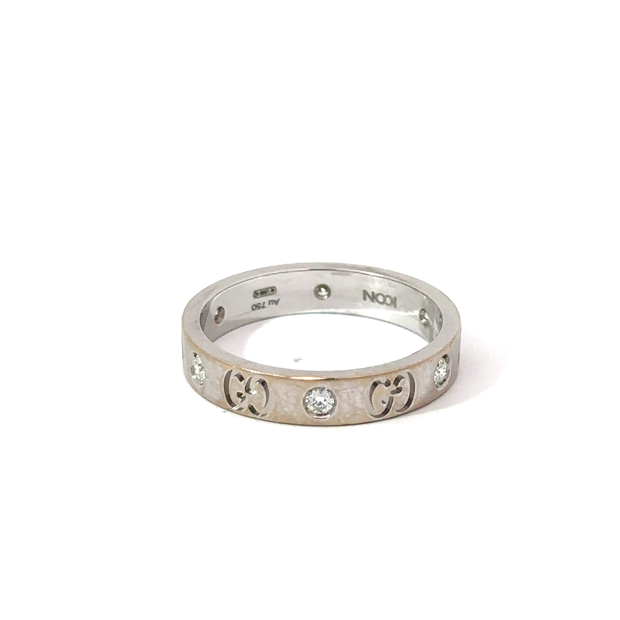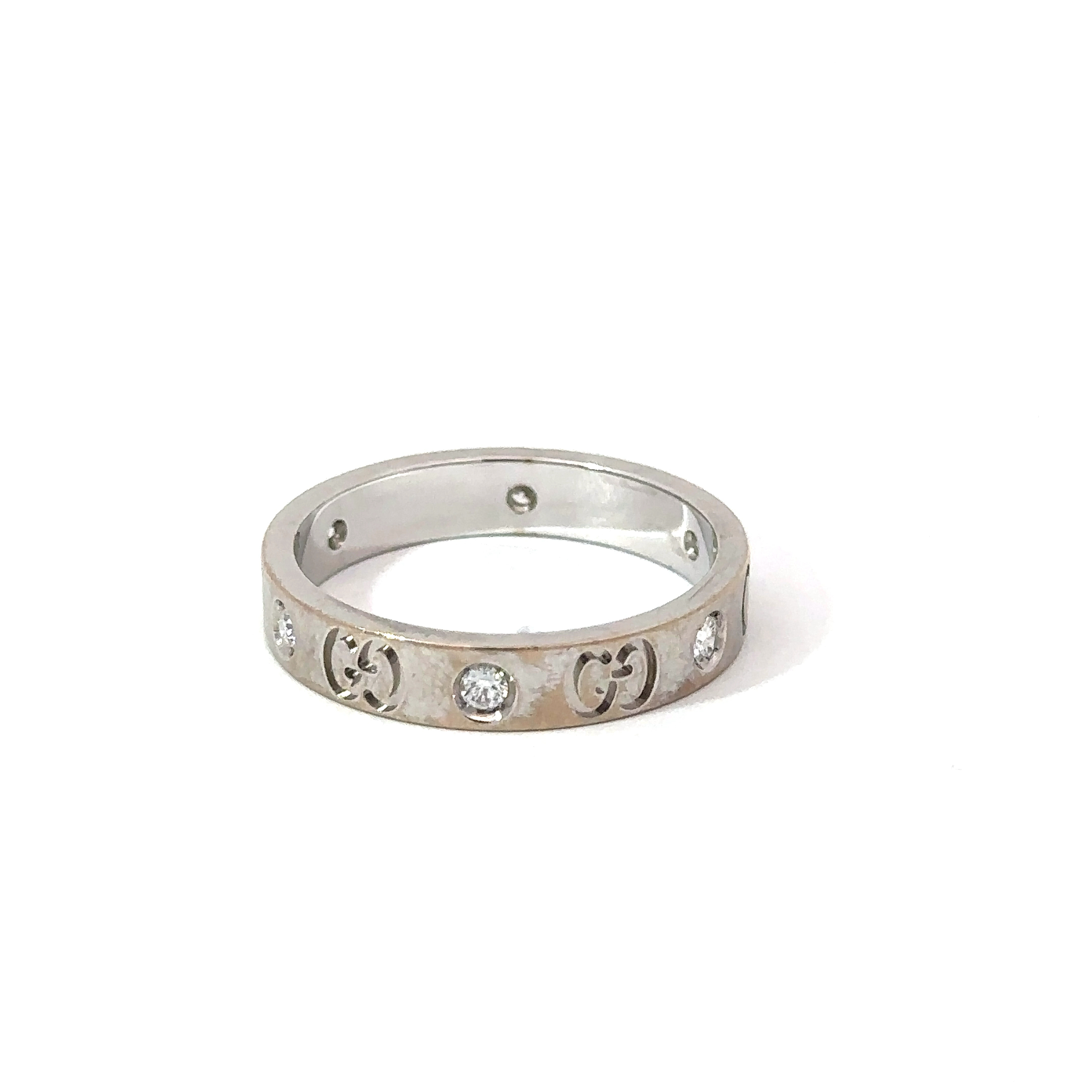 18k Solid white Gold Gucci Diamond Band. This ring features 6 Natural Colorless Brilliant cut diamond set around the perimeter of the band. This Ring also features the GUCCI two G’s Logo around the band. On the inside of the ring is says “Gucci Made in Italy Icon”.
