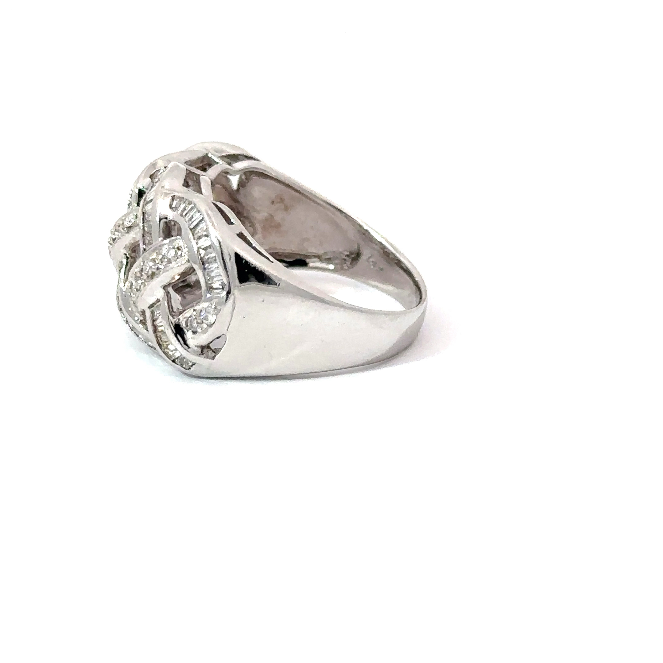 This Ladies ring features a Solid 14k White gold setting designed to look woven. This ring has both Baguette and Round cut diamonds set upon the weave. The diamonds are all natural and there is approximately 1ct Total. This ring is a truly lovely and adds a lot of brightness to any outfit.